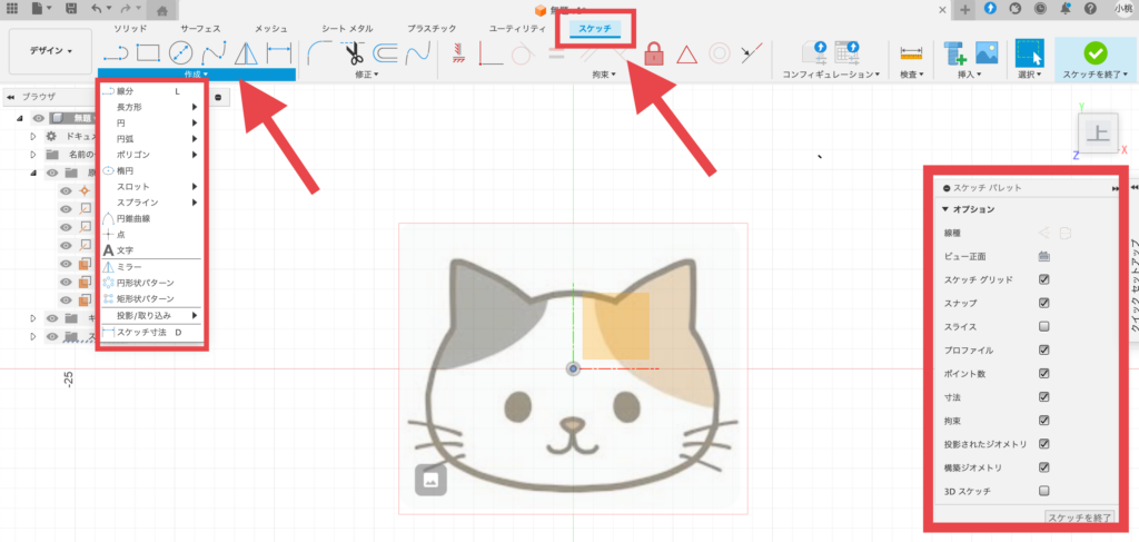 スケッチパレットが表示される、ツールバーがスケッチ状態に変化する