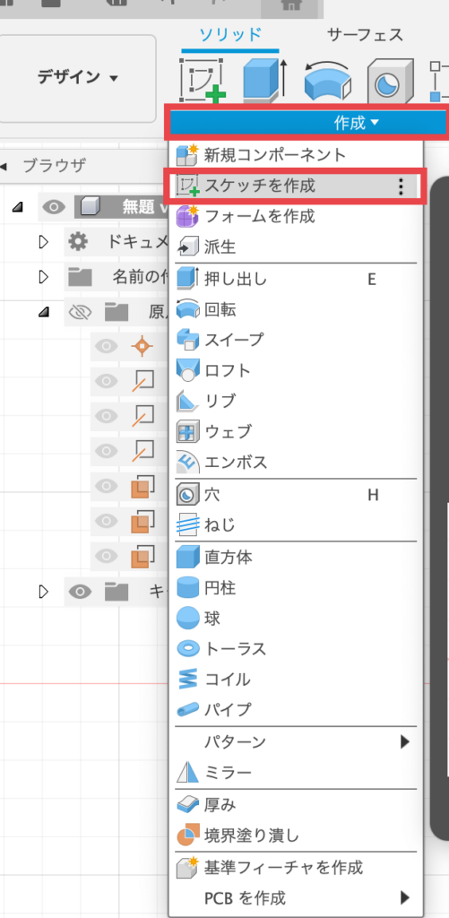 ツールバーの「ソリッド」>「作成」>「スケッチを作成」