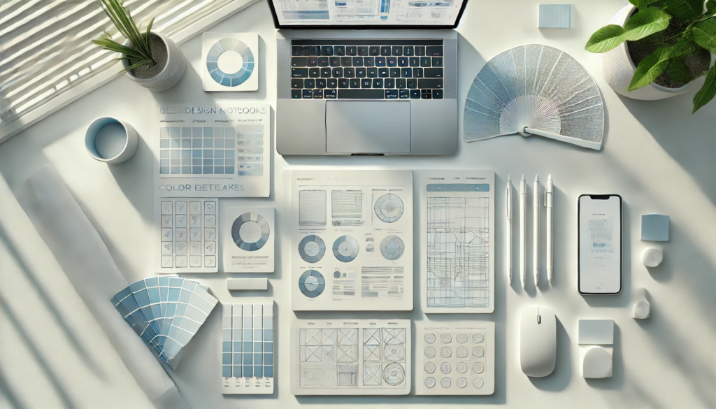 上から見た構図で、白く整ったデスクの上には、開かれたデザインノートやUIスケッチ、ワイヤーフレーム、付箋、カラーパレットのファンが並んでいます。
